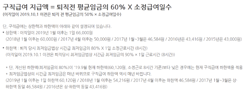 2019년 10월 1일부터 퇴직 전 평균 급여의 60%로 상향되었다고 합니다.